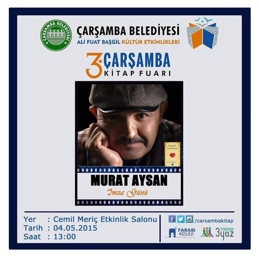 Yazarlarımızdan, Sayın Murat Aysan'ın 04.05.2015 tarihinde Samsun Çarşamba Belediyesi'nin desteği ile Ali Fuat Başgil Kültür Etkinlikleri kapsamında gerçekleşecek olan 3. Çarşamba Kitap Fuarı'nda "Sevgiyle Dokunmak" kitabının imza günü olacaktır.